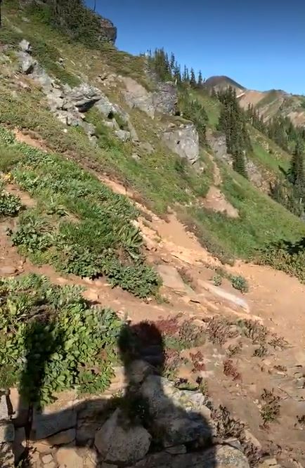 For a second day in a row I had another odd animal encounter. There was a marmot right next to the trail that stopped me. He was standing looking at me and I decided to crouch down to his level. He dropped down to his belly and stared back as curious as I was. At this point I felt more animal than man. My miles were showing.