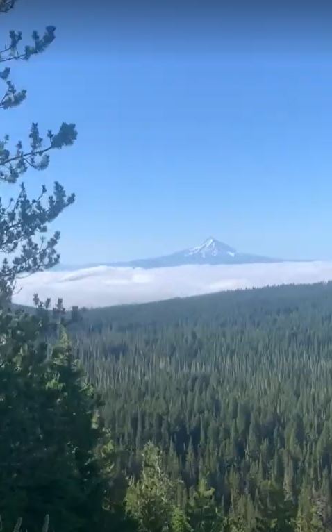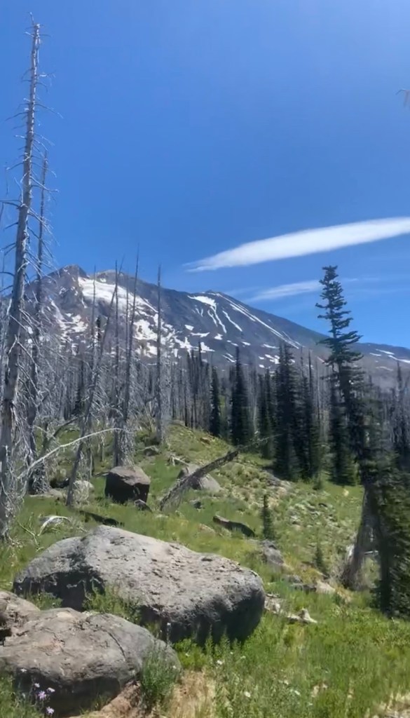 There were still no others this morning so I decided to push on. It was at least sixteen miles to the next road, so I would not be enjoying a hot breakfast. I was rewarded with a view back at Mount Hood, from right in the middle of Indian Heaven Wilderness.