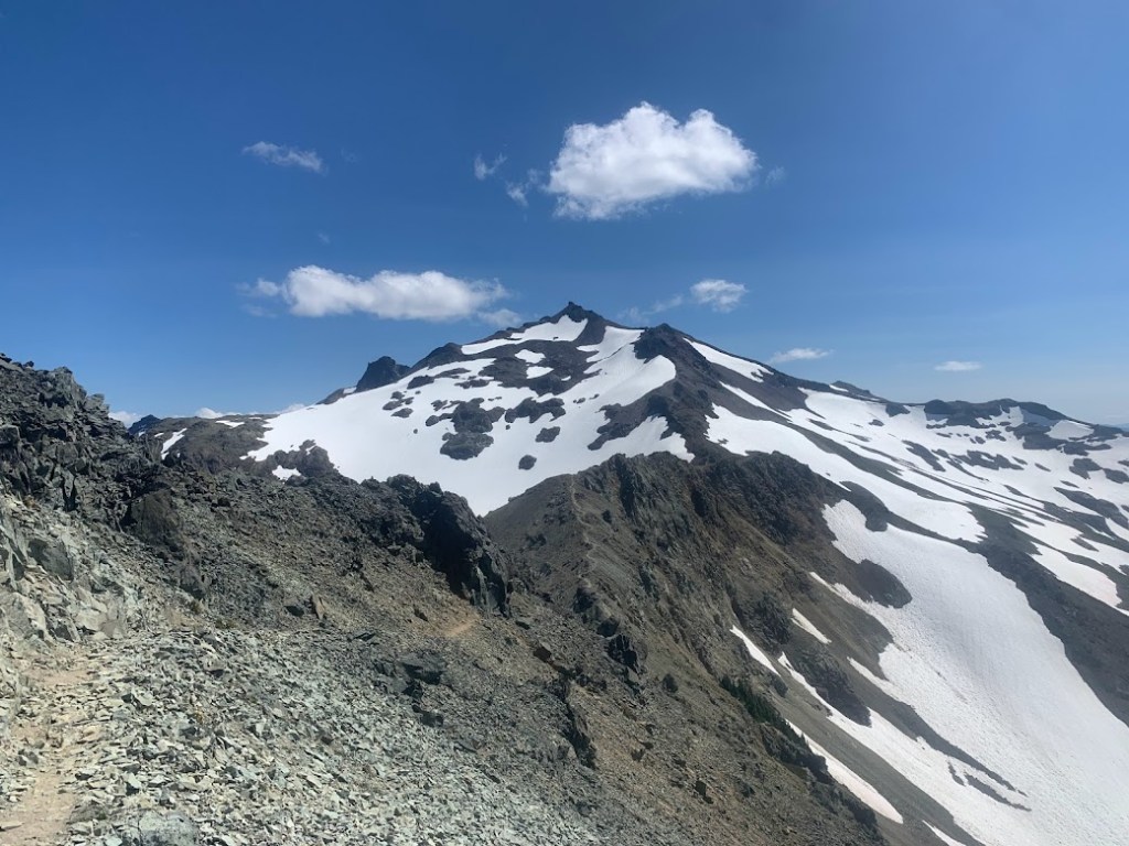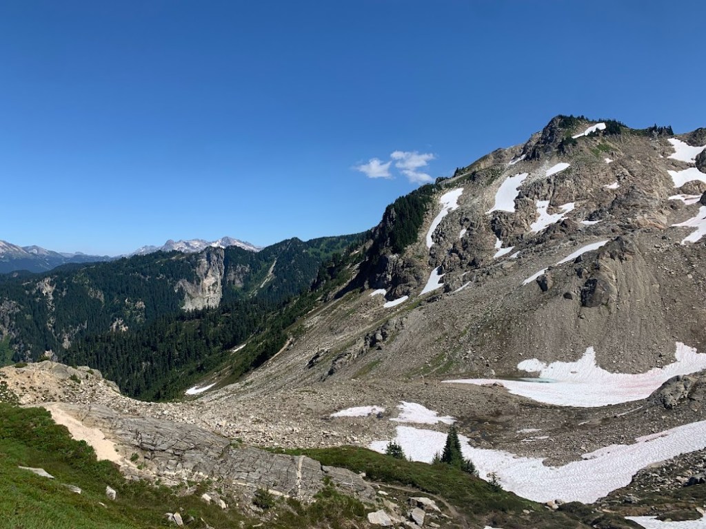 This was the base of Old Snowy Mountain I was traversing. A popular short alternate is to travel around the other side of the peak and come down the Knife’s Edge on the north face. This early in the season I did not have any good information nor any of my snow gear, so I stuck to the main route and took a break at the other end. There was a nice group of day hikers hanging out that gave me some food and insisted I take a few more pictures. I am so glad they did. You can never have enough photos.