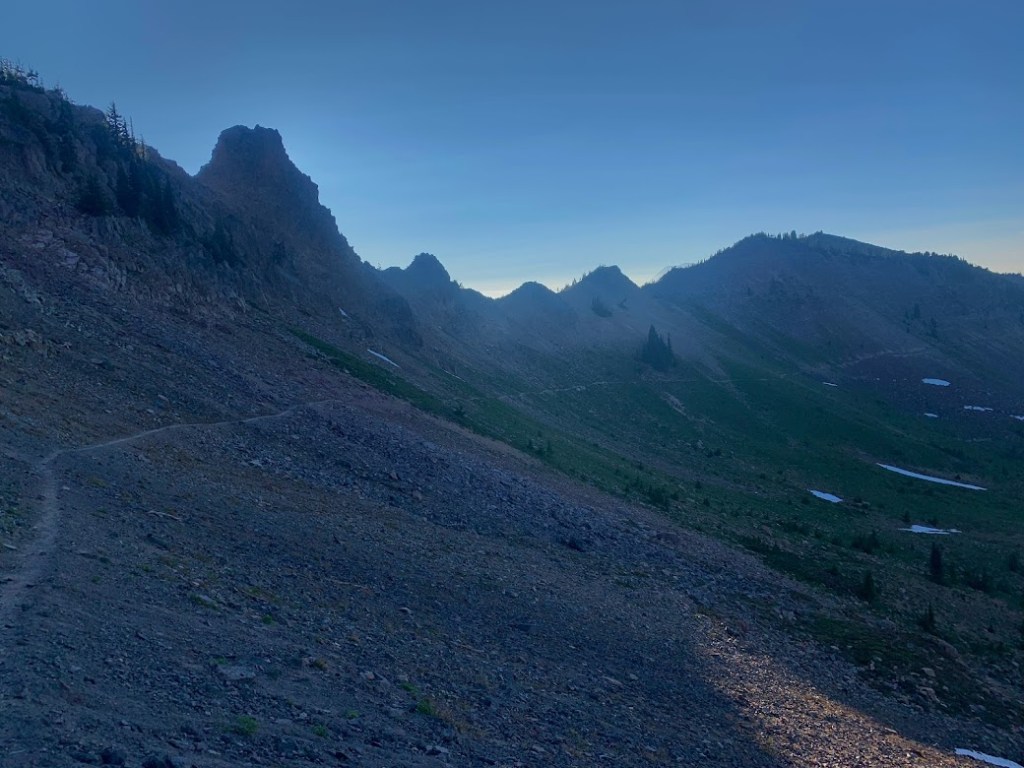 In my golden hour jaunt I passed by a SOBO. He looked surprised to see me but I was sure he had seen the dozen hikers ahead of me. He stopped for a moment and said “Wow I didn’t know anyone else hiked this late.”. I laughed and told him to have a good hike. He may not have noticed but I had a seasoned laugh, recounting all of the nights I hiked into darkness and until midnight or later. He was young and had been on trail for about a week. I on the other hand was numb to the night. Once I reached the twenty mile minimum I stopped for the night at Lemah Creek.