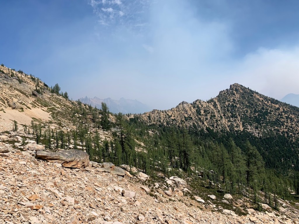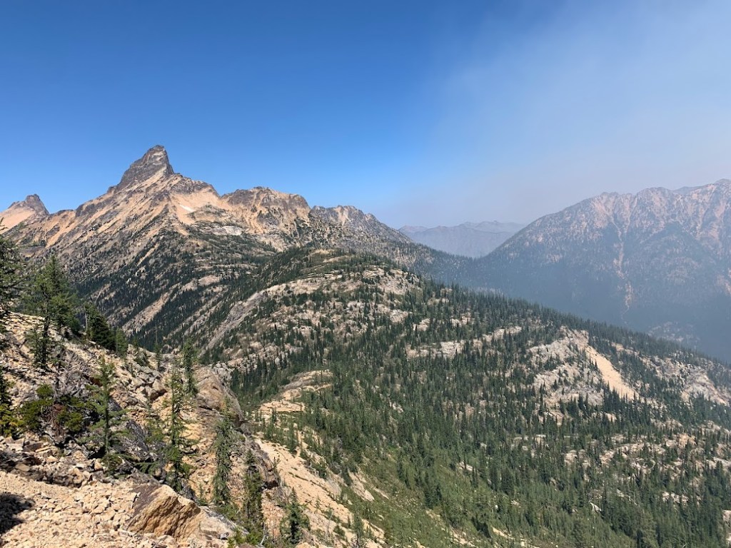 Right at noon I found the border of the wildfire closure at Cutthroat Pass. I was hiking on the edge of the large smoke clouds. In addition to the steep climbs and sun exposure, the slight inhalation of smoke was not conducive to a productive day. I made it twenty nine miles but fell just short of my goal at Hart’s Pass.