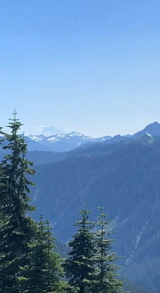 Rainier stayed in sight most of the day. This section reminded me of the couple of days circumnavigating Shasta but this had a more intimate setting with a shorter radius. The peace was interrupted as I approached Chinook Pass at the Highway 410 crossing. It was the middle of summer and this place was crawling with tourists. The bustle of cars and the pedestrian bridge that read “Mount Rainier National Park” signified I was indeed in a popular destination. The pit toilet was nice but nothing magical here so I headed back on the trail. Just a few miles ahead at Sourdough Gap I found phone service and decided to take a break. Here I met “Second” and “Happy Dance”. I think they were doing a SOBO LASH.